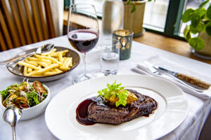 – Ryggbiff med kryddsmör, rödvinssås, tomatsallad och pommes frites
